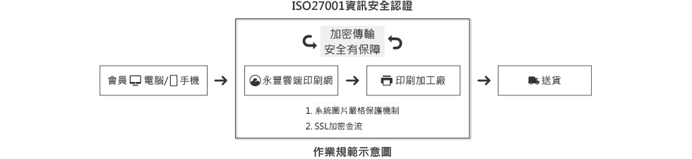 5.針對隱私與著作保護的資訊安全部分,永豐雲端印刷網所屬的公司已經通過 ISO2701 資訊安全管理驗證服務標準並獲得國際認證。(ISO27001詳細介紹 http://en.wikipedia.org/wiki/ISO27001)
