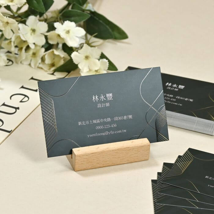 - 風格定位:根據產業屬性設定名片整體風格,例如醫療或法律業適合以簡約、沉穩的風格強調專業形象(如深色底色搭配霧面處理,並以局部上光加強細節質感);餐飲或設計業則可以創意、活潑的風格為主(如亮眼色彩搭配顯色度高的平面卡,並加入導圓角細節),吸引顧客目光。