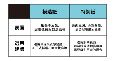 • 特銅紙:表面光滑、印刷效果鮮豔飽和,適合色彩繽紛的設計或品牌形象年輕、活潑、鮮明的餐館,如早午餐或活動宴席等熱鬧的場合。