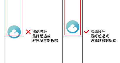 • 對摺處設計最好超過或避免貼齊對折線,儘量避免設計以對摺線分兩邊色塊,才不會產品漏白誤差。