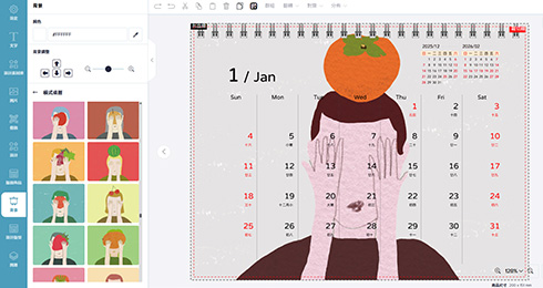 若想自由發揮,我們支援多種設計檔案格式(如 JPG、PDF、AI 、PNG等)上傳,你也可以拖曳設計元件(圖案、文字、背景等)、並有多種日曆格式可選擇,搭配即時預覽,所見即所得,設計彈性十足!