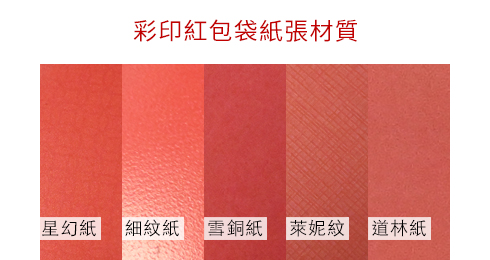 萊妮紙:紙張表面呈十字型紋路,為紅包袋常用材質,顏色印刷色澤較深沉。