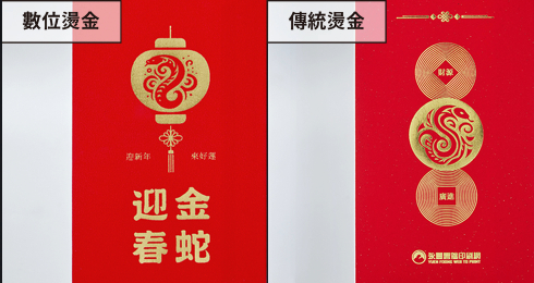 「數位燙金紅包袋」滿足想要少量客製、又想要帶有燙金質感的需求,5張即可製作,還可一次設計5種不同的客製內容!