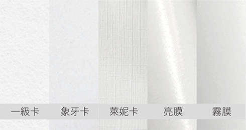 一級卡 250P、象牙卡 220P、萊妮卡 220P、雙面上霧膜 250P、雙面上亮膜 250P