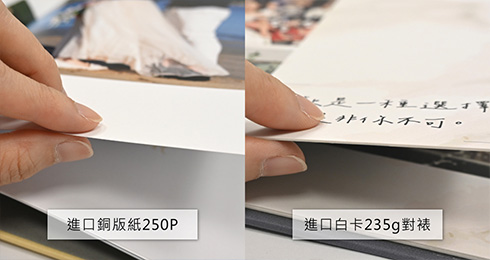 進口銅版紙250P(21*28、21*21) ,紙面潔白細緻平滑、相片印刷顯色度高。
