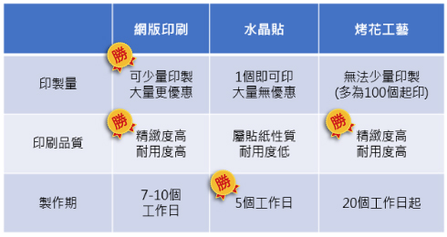 - 網版印刷:印刷精緻度高、耐用度高,少量可印製,大量印製價