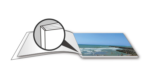 最輕巧便利的裝訂方式,書封完整貼覆內頁。平裝的膠裝方式,無法攤平,會有些許影像為裝訂邊,所以會損失跨頁交接處部分影像。不建議使用跨頁編排方式,避免將重要圖文編排至中央部分。