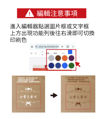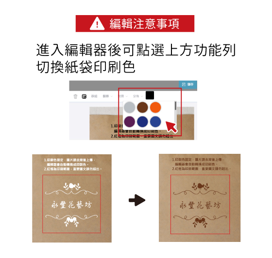 紙袋印刷色固定,可於編輯器內切換印刷色,上傳的圖檔將會自動變色。