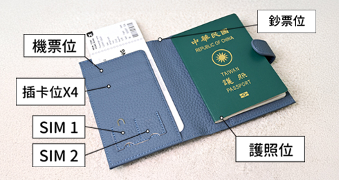 同時可放置護照、多張卡片、機票、鈔票,SIM卡針,背面有拉鍊袋設計可放置零錢。