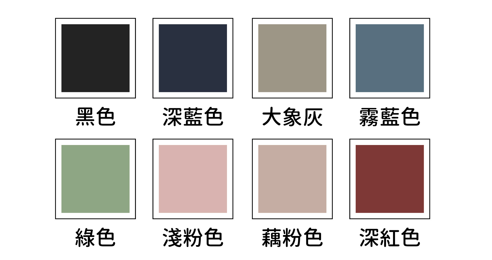 黑色、深藍色、大象灰、霧藍色、深紅色、綠色、淺粉色、藕粉色。