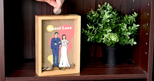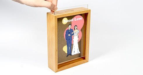 清新北歐風格的櫸木紋實木框,厚實穩固,正面搭配可客製圖案的清透壓克力板,打造獨一無二的專屬存錢筒,紙鈔零錢皆可投入,將壓克力上推出即可取出內容物,不僅實用,作為家中擺飾或紀念贈禮也相當合適。*壓克力厚度約1.5mm。