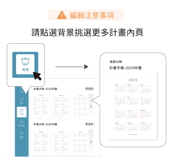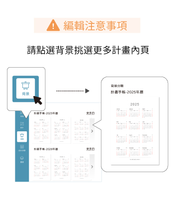 內容可隨意挑選放置喜歡的計畫格式類型 A5、B6尺寸:個人頁,2025 & 2026年曆、2025 & 2026年計劃表、月計劃表、GOALS、21天習慣養成計畫。