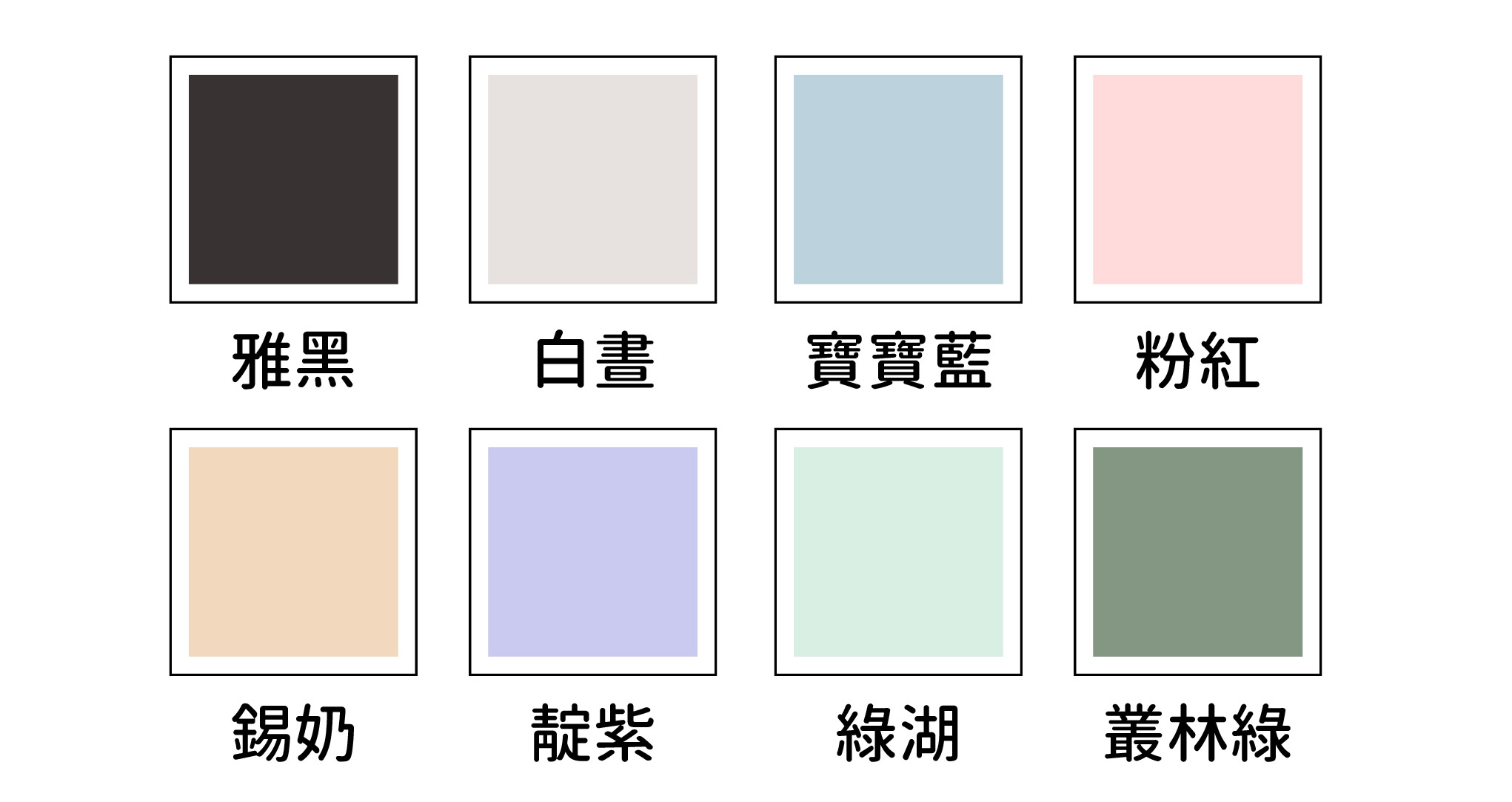 雅黑、白晝、寶寶藍、粉紅、錫奶、靛紫、綠湖、叢林綠。