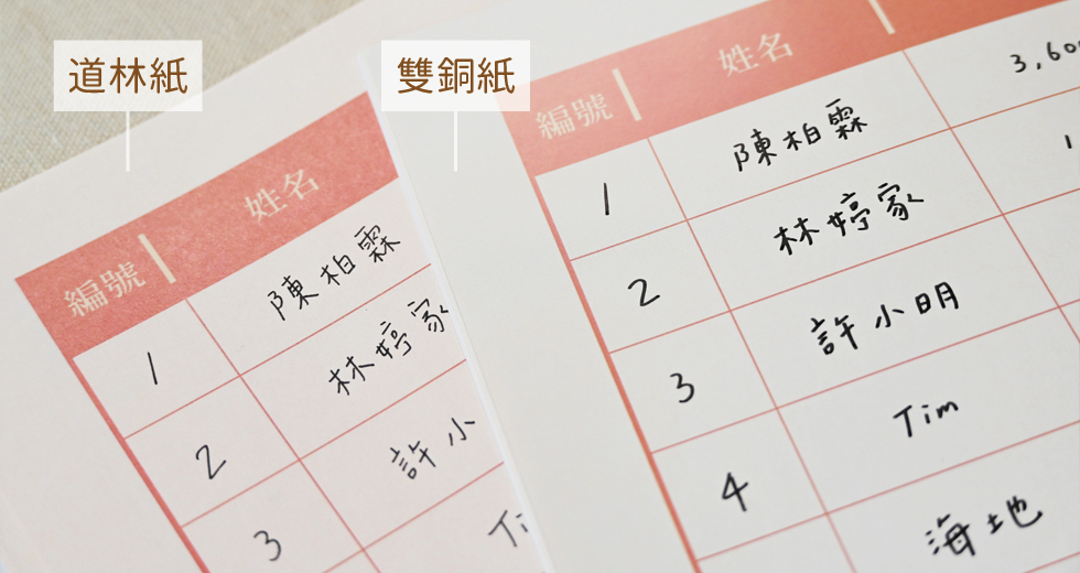 100g白道林:手感細緻,表面平滑,水性與油性筆皆適用。150g雙銅紙:光澤度強,表面滑亮,適合油性筆書寫。