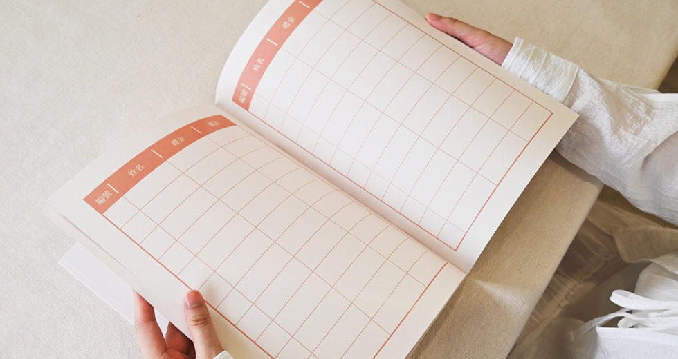 左翻頁設計,輕薄易翻閱書寫,頁數20頁,共可寫144筆。